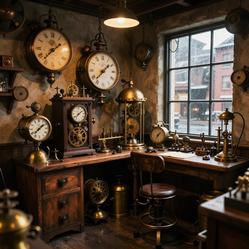 Sb: a cozy steampunk workshop filled with intricate gadgets and clockwork devices, warm ambient lighting, wooden and brass textures, a large window showing a rainy cityscape outside, detailed environment with a vintage aesthetic