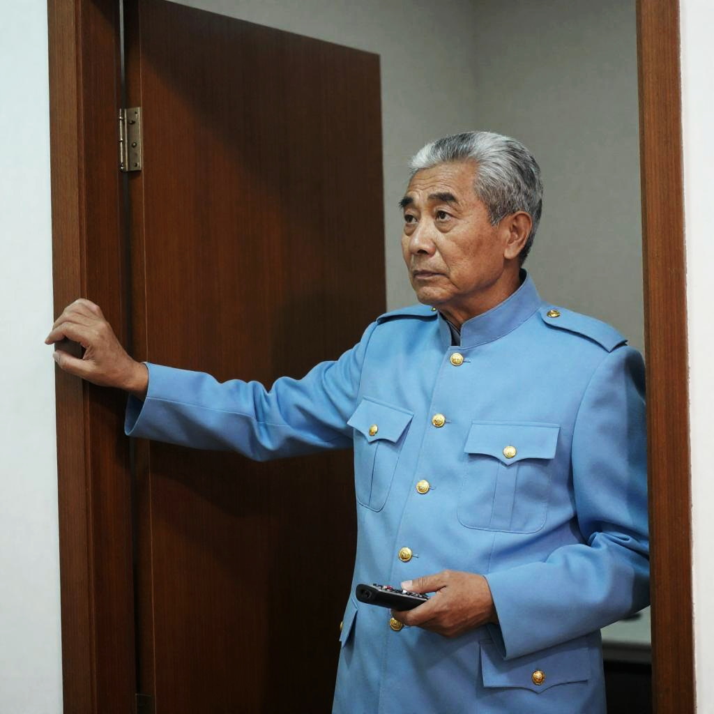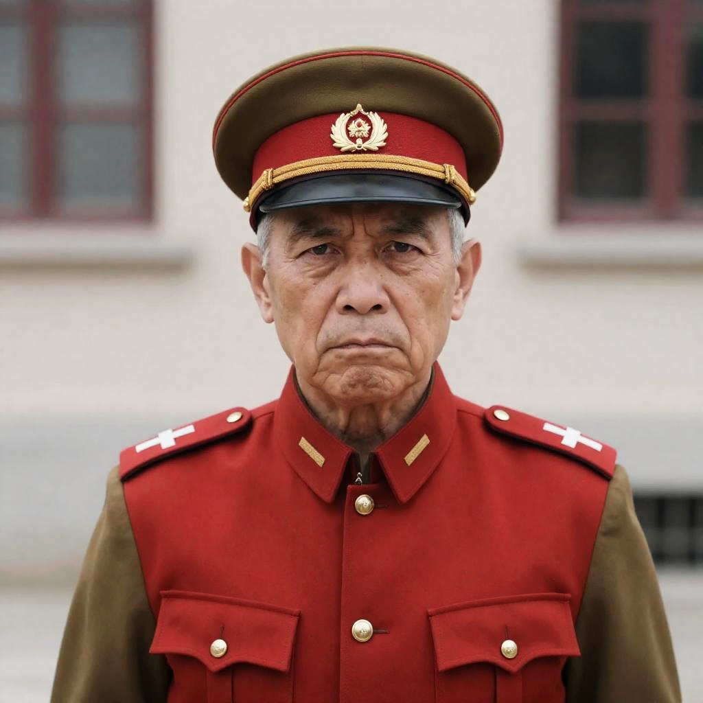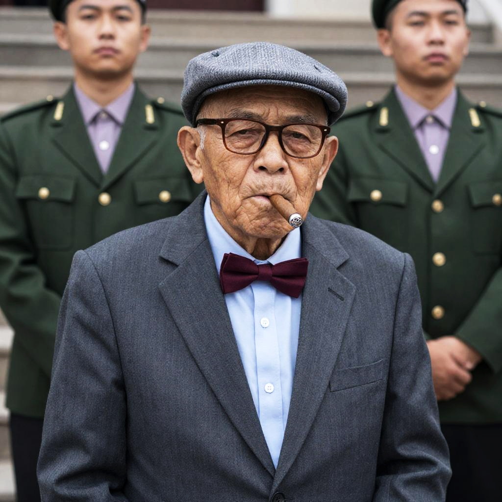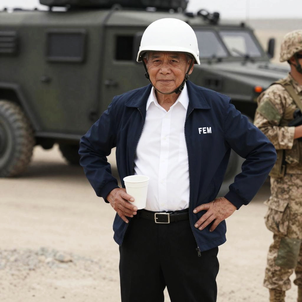 Old man in white helmet and navy jacket with "FEM" , white shirt, black pants, holding white cup. Background: military vehicle, soldier in camouflage. Rocky, sandy terrain. Man with hands on hips, slight smile, soldier partially visible.