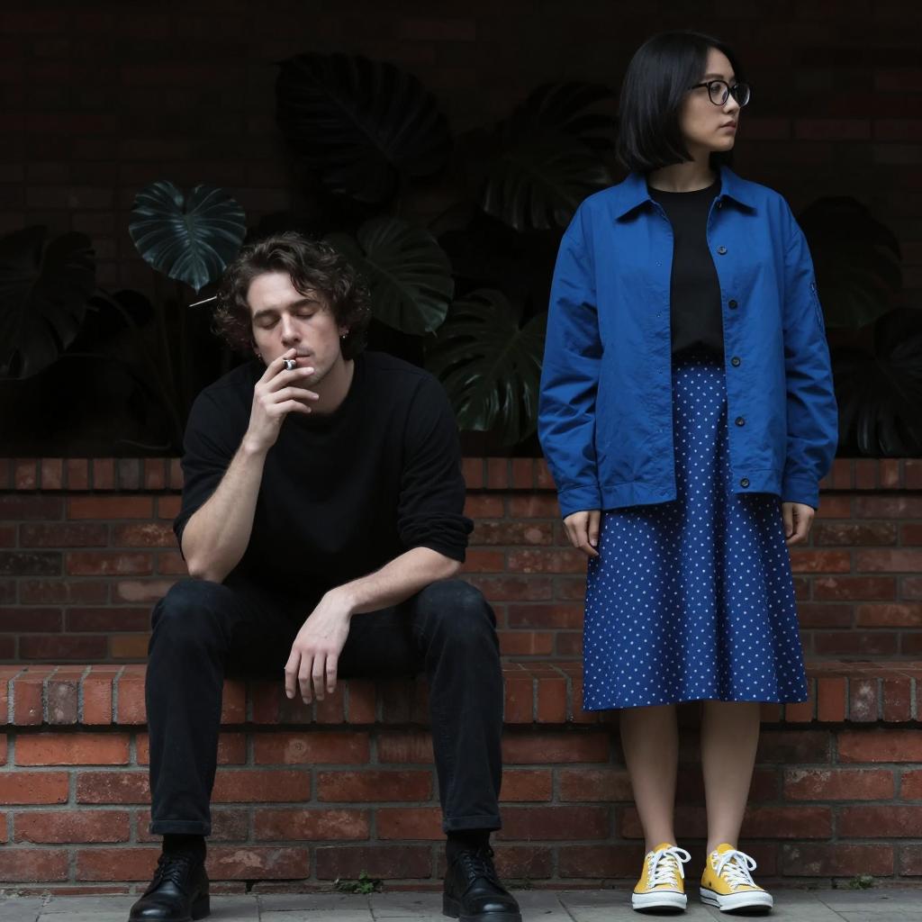 Photograph of two people. Man with dark hair, black shirt, and black pants, sitting, smoking a cigarette, eyes closed. Woman with short dark hair, glasses, blue jacket, and blue polka-dot skirt, standing, wearing yellow sneakers, looking away. Background: brick wall, dark foliage. Soft lighting from below, casting shadows. Man seated on edge of brick, woman standing to the right.