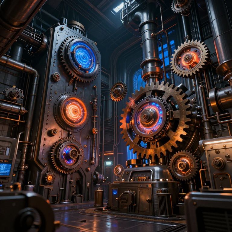 GregTech machine workshop, intricate steampunk factory filled with complex gears, pipes and glowing energy cores, dark metallic textures with vibrant blue and orange highlights, futuristic industrial environment, highly detailed machinery panels, dynamic lighting