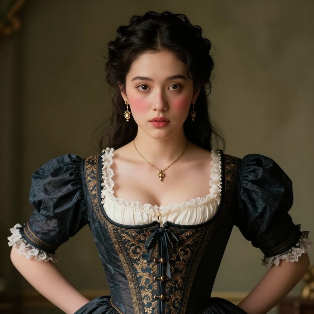 ((masterpiece, best quality, highres, realistic)) Perfect Face, 1girl, Wide hips, Skindentation, blush, masterpiece, establish, dhevictorian, victorian dress, corset, shirt, embroidery, kumbhiradef, horn ribbon, earrings, necklace