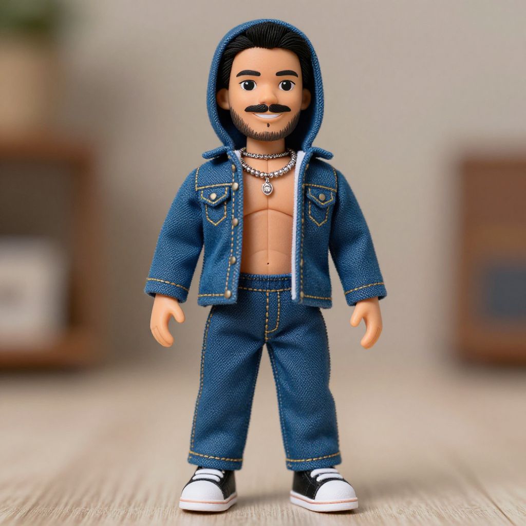 Photograph of a male LEGO figurine with tan skin, black hair, and a mustache. He is wearing a blue denim jacket with a hood, open to reveal a bare chest adorned with a necklace, and matching blue denim pants. He also has black and white sneakers. The background is blurred, featuring indistinct brown furniture on a light wooden floor, emphasizing the figurine. The figurine has a small, square-headed design typical of LEGO figures.