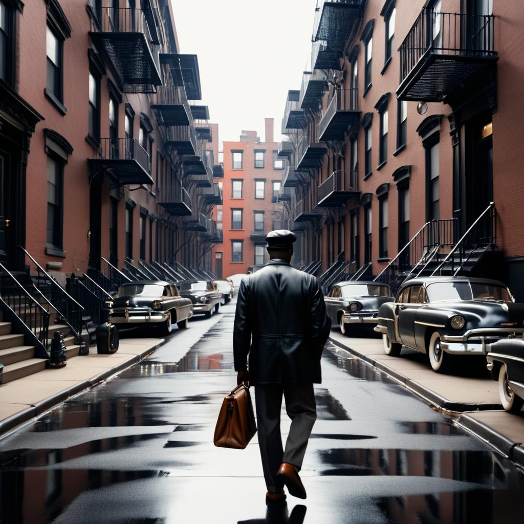 Cinematic street view of an African American man dressed in a black leather jacket and gray trousers walking down a wet street lined with brownstone buildings and vintage cars. The scene evokes the Harlem Renaissance era, featuring classic architecture and period details in a New York neighborhood. The man carries a brown leather briefcase and wears a hat, captured from behind with dramatic natural and artificial lighting.