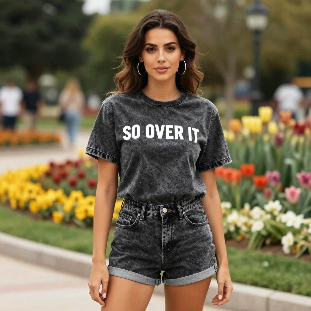 A woman, in a casual streetwear style, wearing an acid wash black denim t-shirt with SO OVER IT on the front and matching denim shorts, standing in a scenic park with colorful gardens, surrounded by vibrant flowers and greenery. Sexy. Pretty face and beutiful eyes