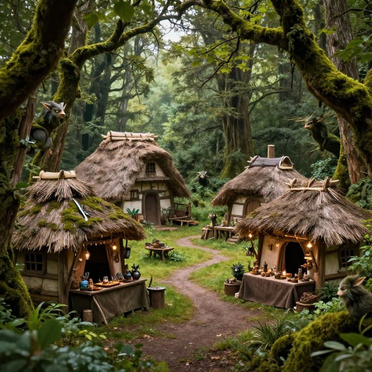 Forest village DnD setting featuring a cozy cluster of thatched cottages surrounded by dense mossy woods, elves crafting weapons and potions at open-air stalls, mythical creatures peeking through foliage, soft ethereal light filtering through thick branches, rich vibrant colors, high fantasy atmosphere.