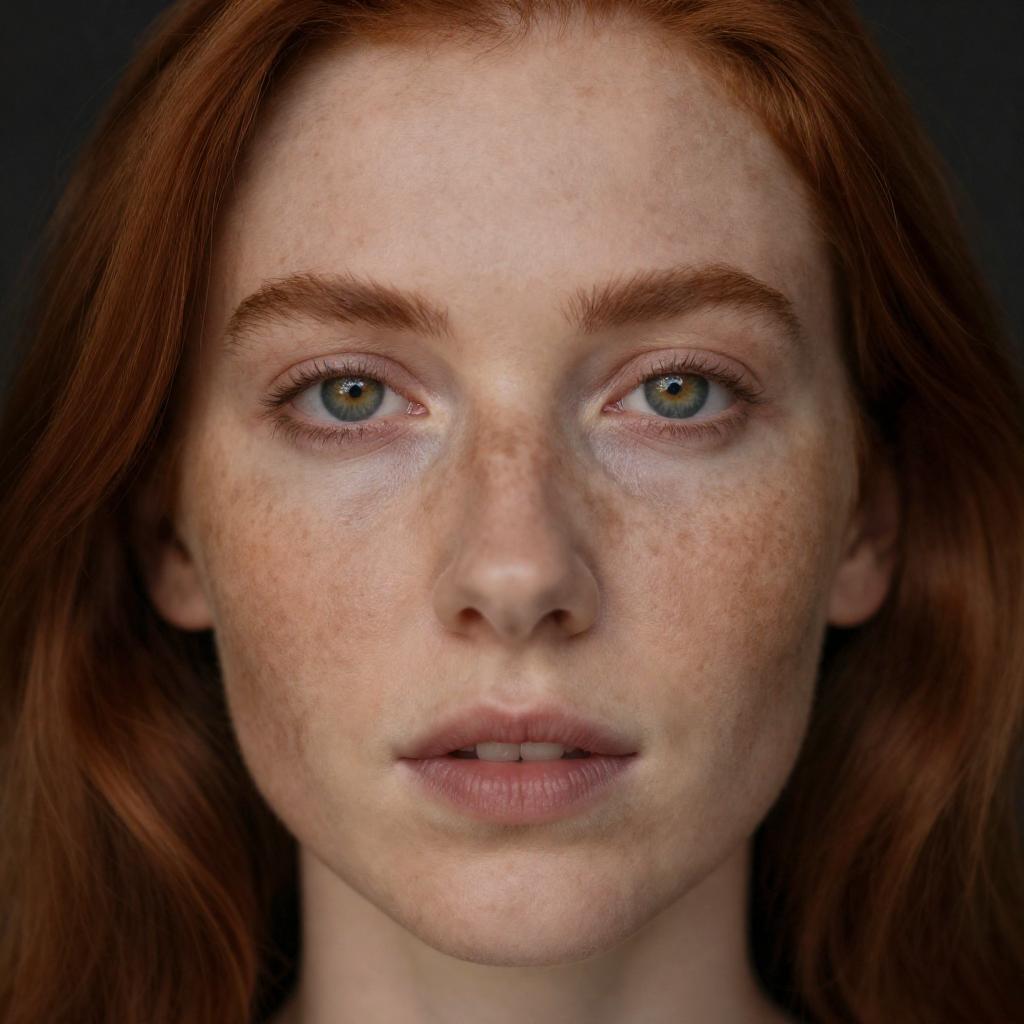 Close-up photograph of a fair-skinned woman with red hair, green eyes, and freckles. She has slightly parted lips and a neutral expression. Dark background. Woman's face occupies the center, with her hair framing the top.