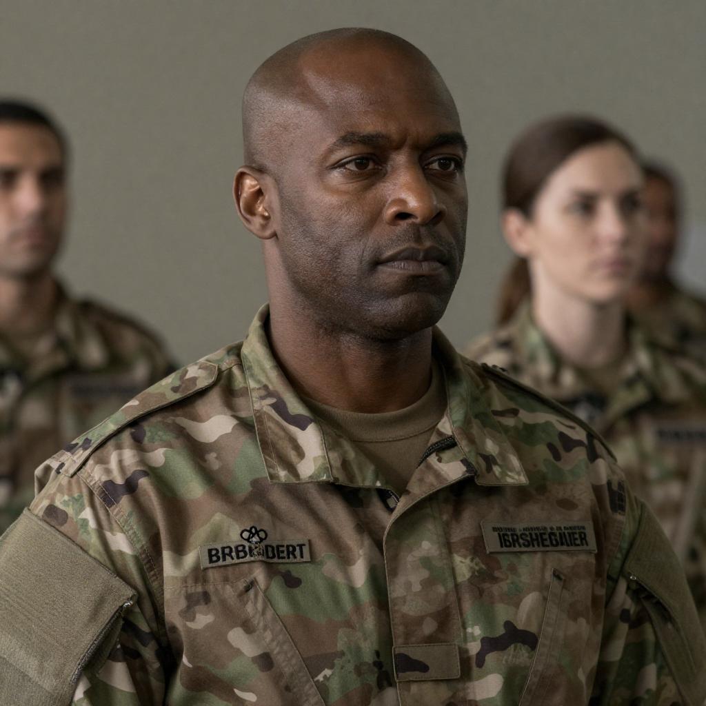 Photograph of three soldiers. Foreground soldier: bald, medium brown skin, intense expression, camouflage vest, shoulder strap. Background soldier: light brown skin, short hair, neutral expression, camouflage vest. Third soldier: light brown skin, brown hair in bun, serious expression, camouflage vest. Indoor setting, dim lighting.