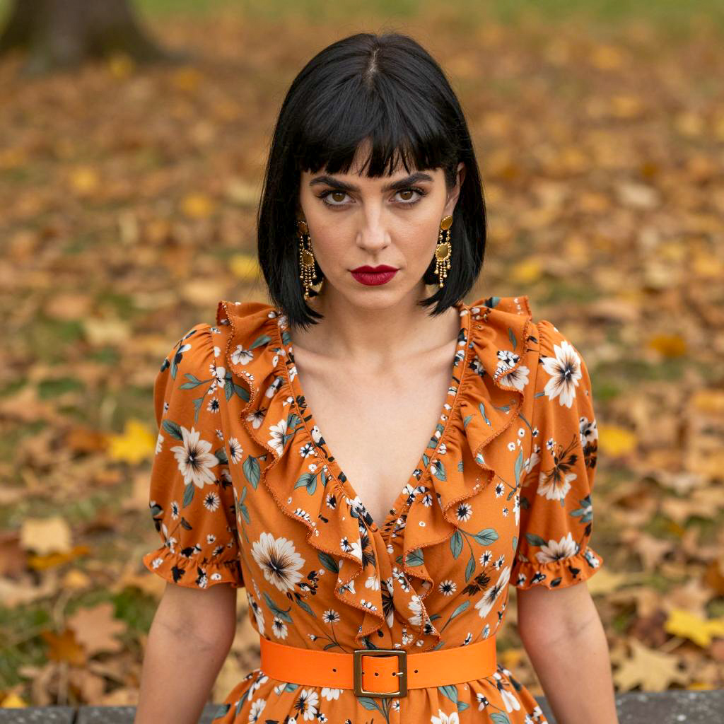 Woman with black bob haircut, intense gaze, wearing orange floral dress with ruffled neckline, gold chandelier earrings, sitting outdoors. Autumn leaves in blurred yellow background. Photographic style. Orange belt at waist. Light skin, red lipstick. Upper body centered.