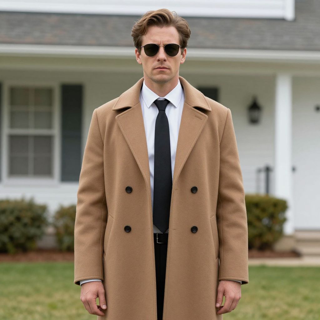 Photograph of a Caucasian man with short, dark brown hair and styled neatly, wearing black sunglasses, a tan double-breasted overcoat with black buttons, a white dress shirt, and a black tie. He stands in front of a white house with dark blue shutters, a black lantern, and green shrubs on the lawn. The man's expression is serious, and he has a gold ring on his right hand. The overcoat is well-fitted, and the background is slightly out of focus, emphasizing the subject. The image has a slightly edited, high-contrast style.
