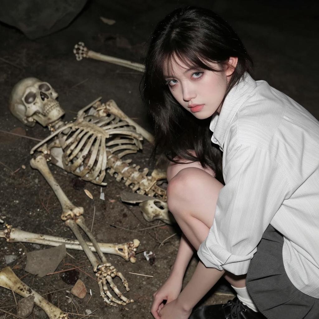 Young woman with pale skin, dark hair, and serious expression, wearing a white striped shirt, crouches beside a decaying skeleton in a dark cave with scattered bones and dirt. Skeleton lies on its back, partially covered in debris.