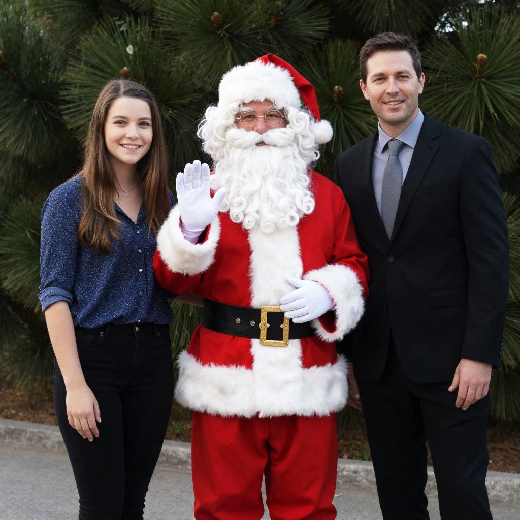 Photograph of three people outdoors. Santa Claus with white beard and red suit stands center, waving. Young woman with long brown hair, blue patterned shirt, and black pants stands left, smiling. Man with short brown hair, black suit, grey shirt, and grey tie stands right, waving. Pine trees in background.