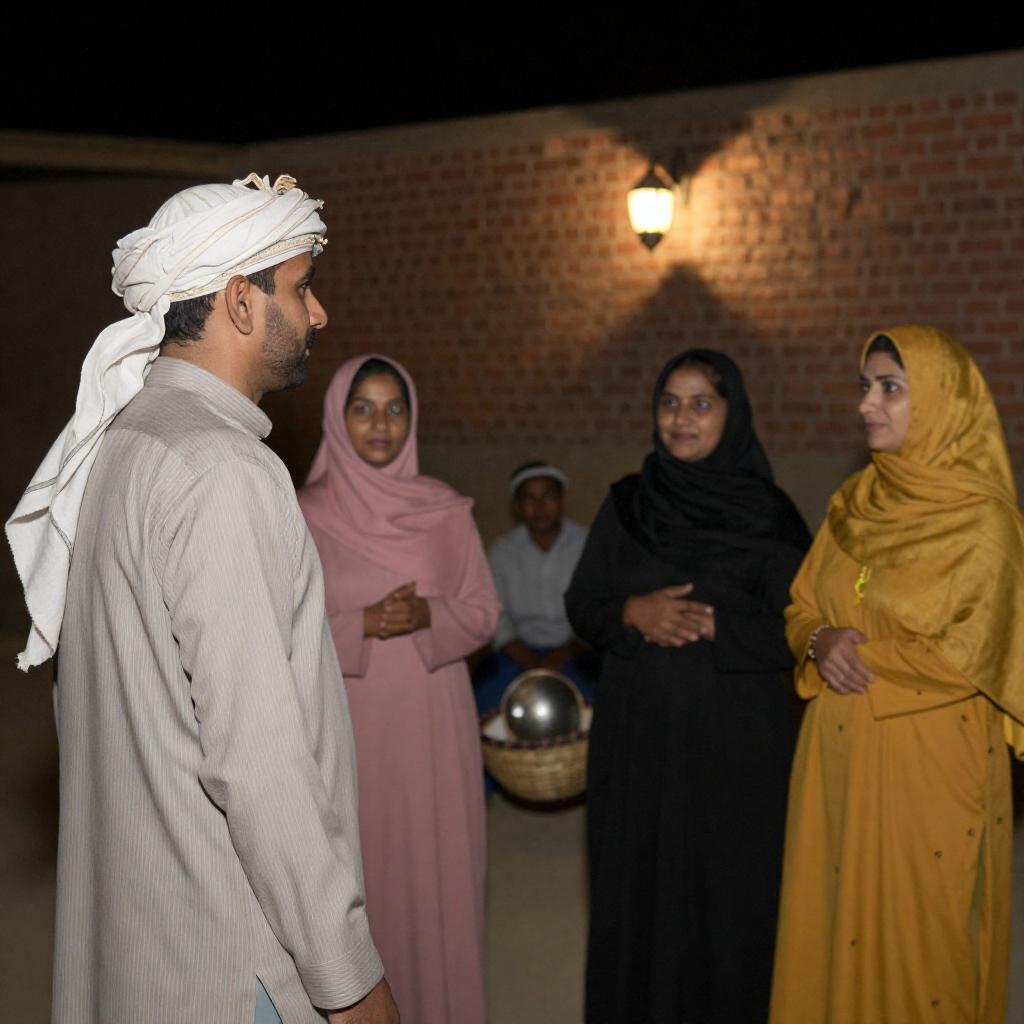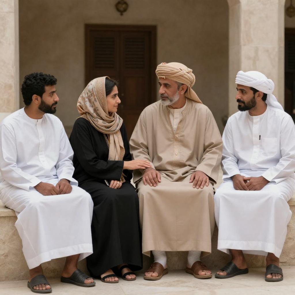 A Middle Eastern family sitting on a stone step in traditional clothing. The middle-aged man wears a beige turban and long beige robe, holding hands with a woman in a black abaya and patterned beige headscarf. Two other men in white dishdashas are seated on either side. The background features stone pillars and a wooden door, suggesting a traditional architectural setting.