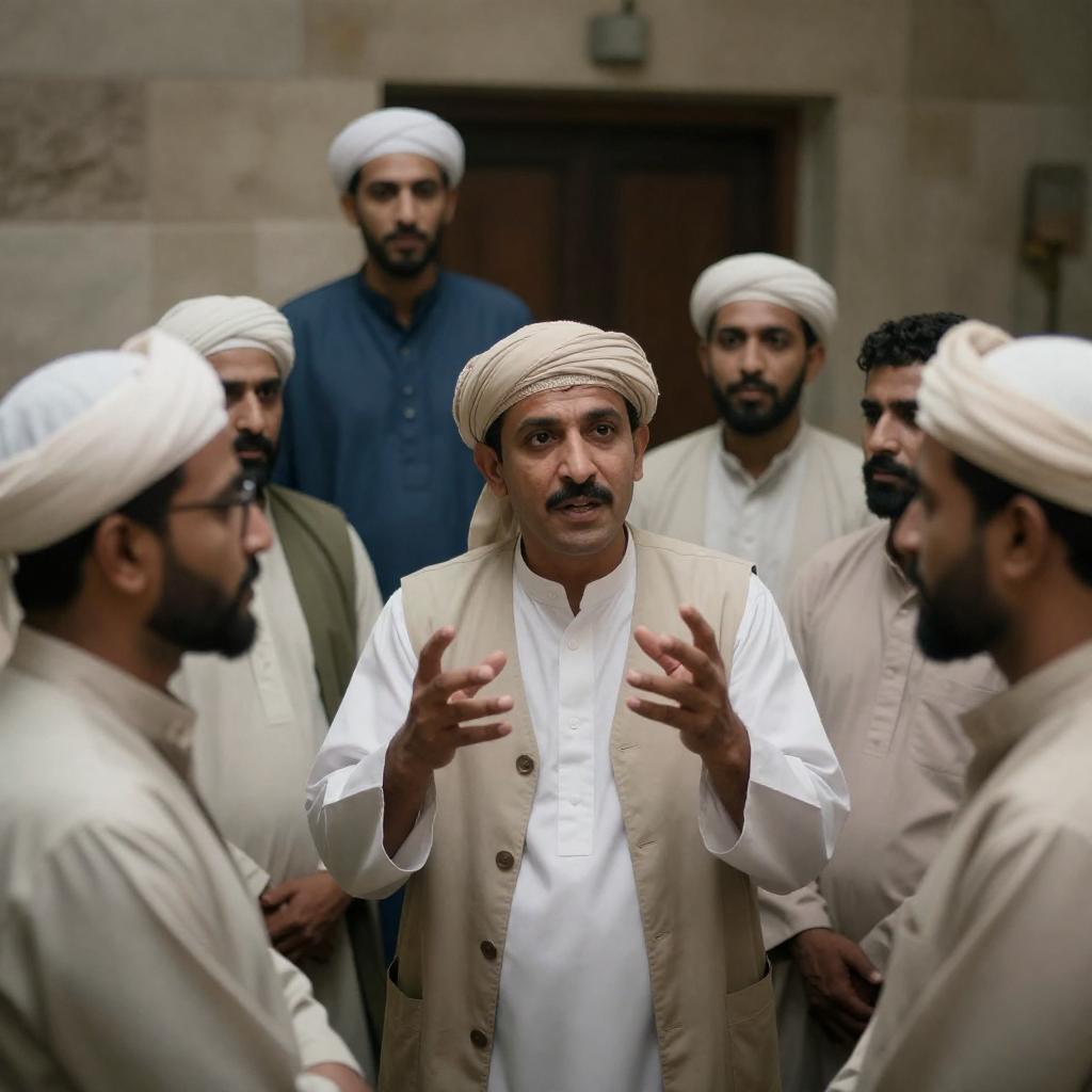 Photograph of a Middle Eastern-style scene. A middle-aged man with a beige turban and long robe sits on a stone step, holding hands with a woman in a patterned headscarf. Two men, one with dark hair and beard, the other with a white turban, sit on either side. Background includes stone pillars and dimly lit room.