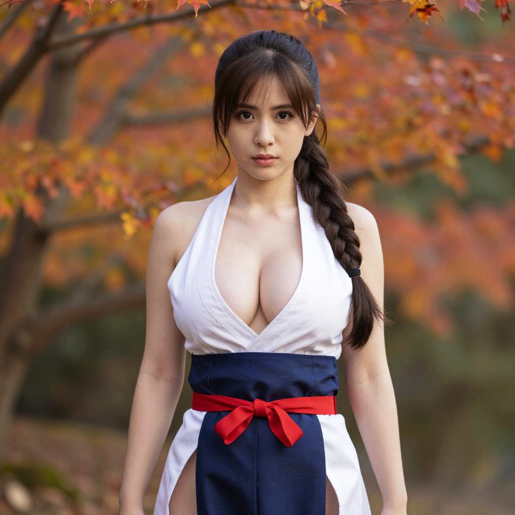 Photo, realistic, detailed lighting, shiranui mai, kunoichi dress, large breasts, ponytail, standing, autumn trees, leaves