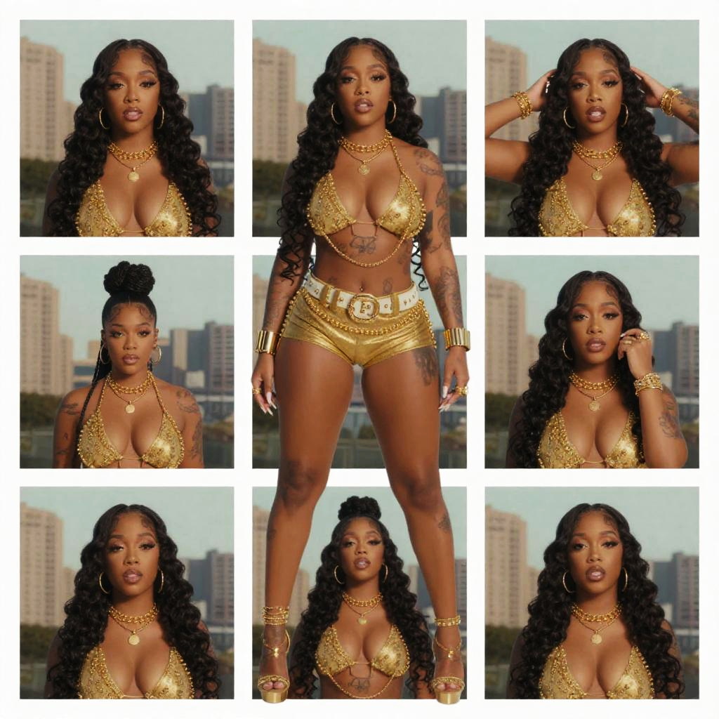 Collage of nine images featuring a confident Black woman styled like Megan Thee Stallion. She wears a gold bikini top, matching gold shorts, and statement gold jewelry including chains, bracelets, and hoop earrings. Hairstyles alternate between long, wavy black hair and braided updo. The background shows a blurred urban cityscape with high-rise buildings. The overall vibe combines modern and vintage hip hop style with bold, glamorous fashion and strong confident poses.