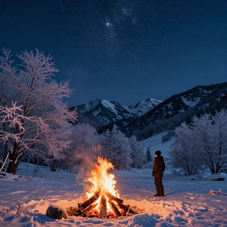 Photograph of a nighttime winter scene featuring a person standing beside a vibrant, orange campfire in a snow-covered forest. The person, dressed in dark winter clothing with a hood, faces the fire. Surrounding the fire are frost-covered trees, their branches glistening under the moonlit sky. The background showcases a starry night sky with the Milky Way visible, and snow-capped mountains. The fire casts a warm, orange glow on the snow, creating a stark contrast to the cool, dark blue and white of the surrounding landscape. The scene exudes a sense of tranquility and isolation.