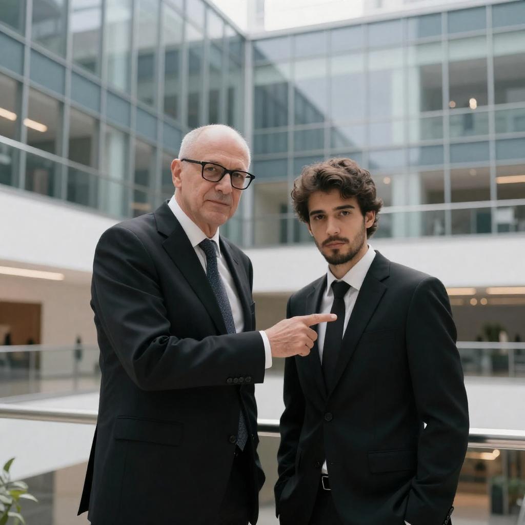 Photograph of five people standing closely together. Three men in the front: curly-haired man in black jacket and white shirt, man in beige suit with blue shirt and patterned tie, man in black jacket with white shirt. Two women in the background. Curly-haired man and man in beige suit smile, man in black jacket has arm around beige suit man. Background includes white wall and other partially visible people.