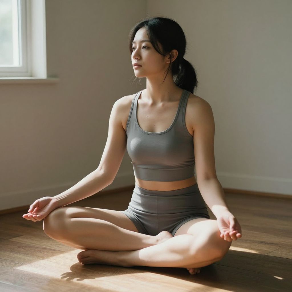 In a quiet corner bathed in soft sunlight, a woman sits cross-legged, her body relaxed yet poised, embodying the serene aftermath of effort—a moment of introspective stillness where the rhythm of her breath mirrors the ebb and flow of life itself.