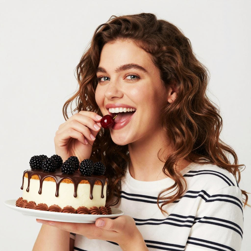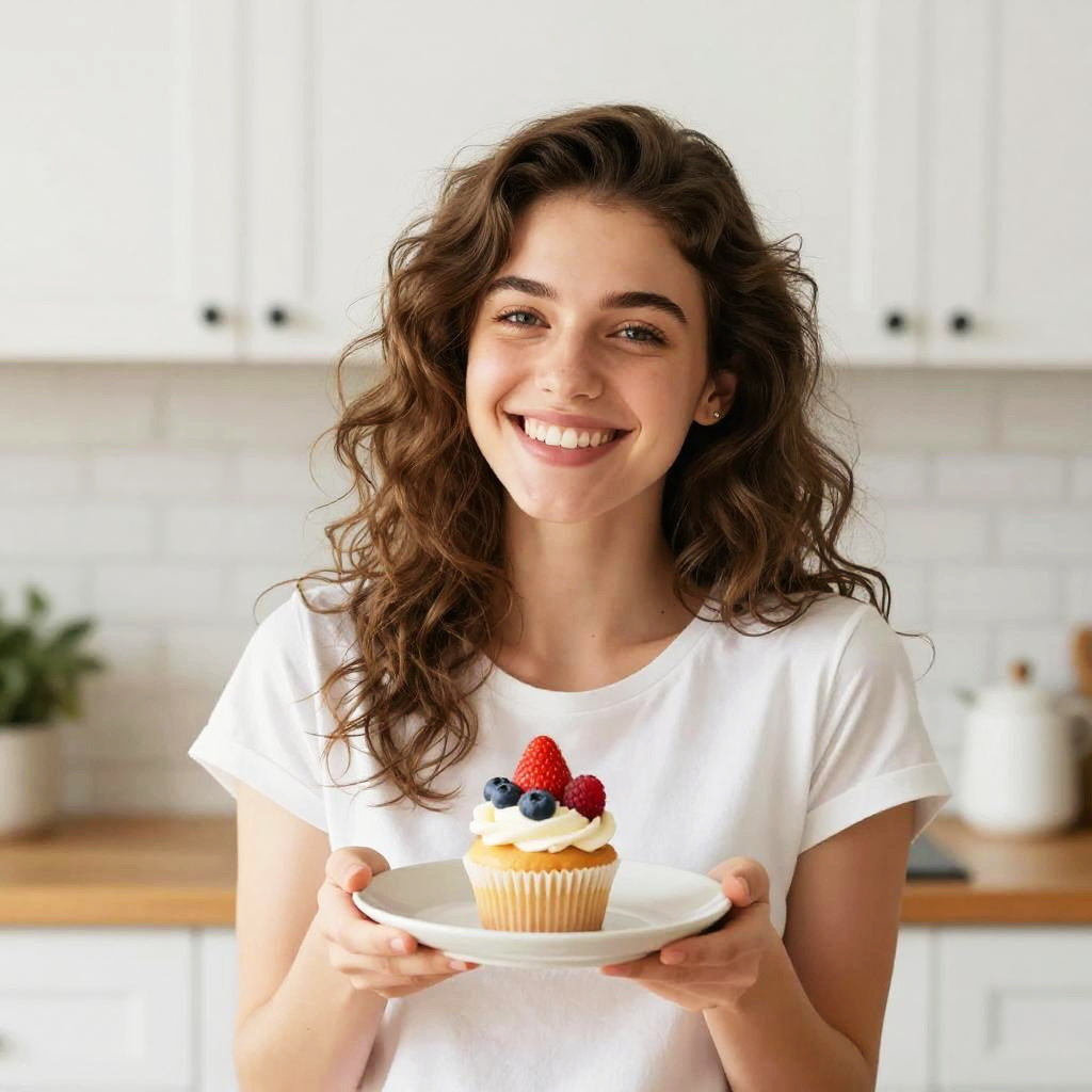 A bright, cheerful photograph of a young woman with wavy brown hair and a wide smile, holding a white plate with a cupcake topped with strawberries, blueberries, and raspberries. She's wearing a simple white t-shirt, and the background is a softly blurred, white kitchen with minimalistic decor. The natural light enhances her warm, friendly expression.