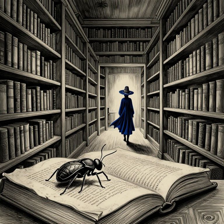 Craft an enigmatic digital artwork by blending the haunting pen-and-ink style with dreamlike surrealism. Depict a library scene from a unique perspective, possibly from an insect's viewpoint as it rests on a weathered book, showcasing towering shelves filled with ornate tomes. Dramatic shadows play along the walls, creating intricate patterns that evoke intrigue and wonder, while a solitary figure in midnight blue navigates through labyrinthine aisles. This enigmatic character, their face concealed beneath a complex hat, exudes an emotional spectrum of solitude, curiosity, and the quest for lost wisdom.