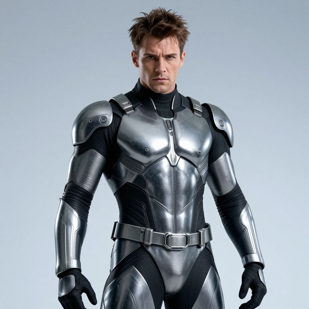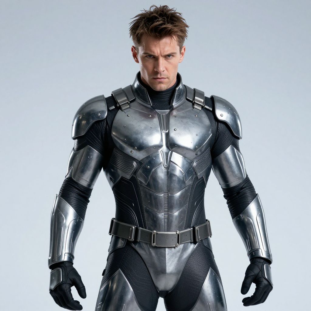 A photograph of a muscular man with short, tousled brown hair, wearing a sleek, metallic silver and black armored suit. The armor has reflective surfaces and intricate designs, with black gloves and a belt. His expression is serious and focused. The background is a simple, gradient light blue, making the character stand out prominently. The suit looks high-tech and futuristic.