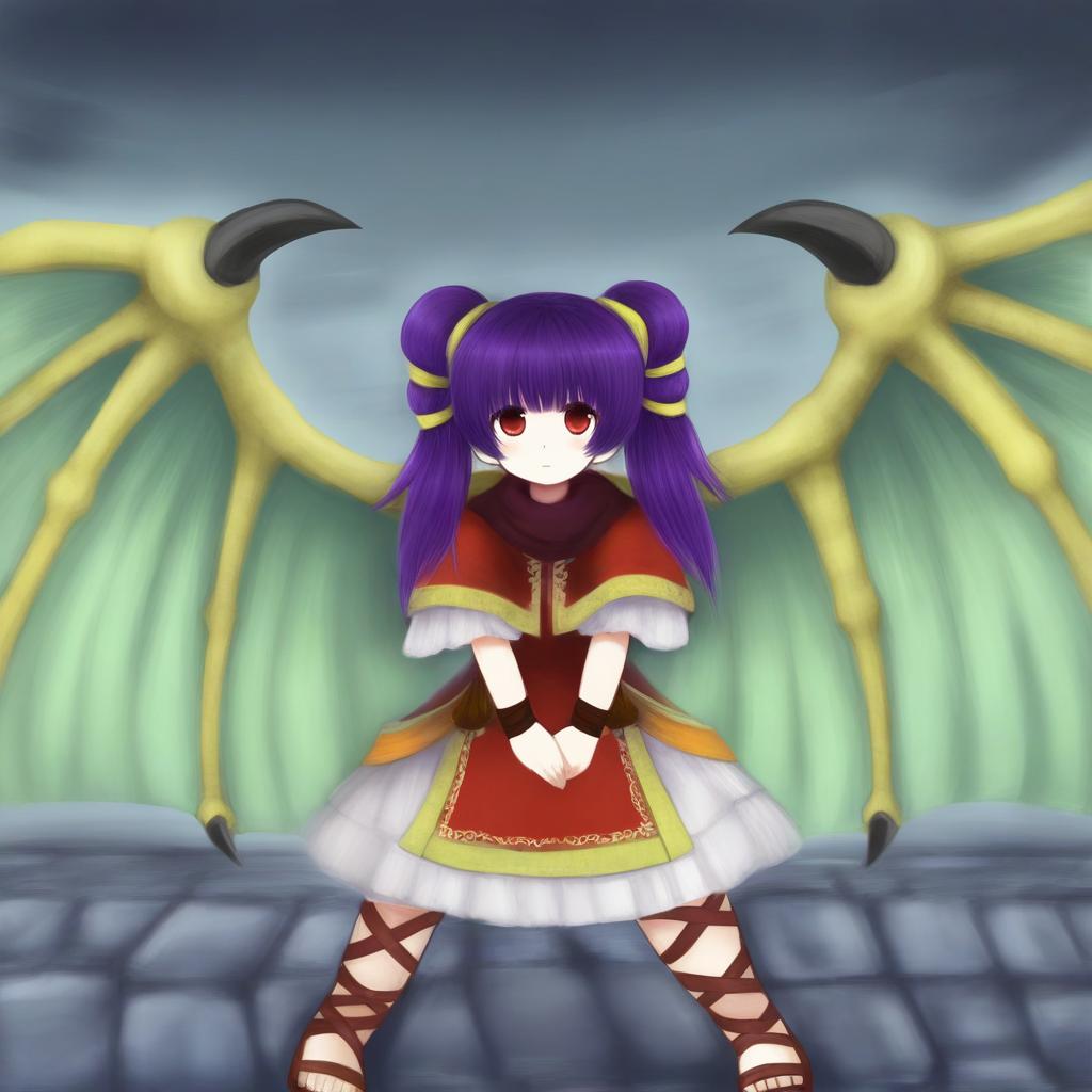 Digital anime-style drawing of a young girl with long purple hair in twin buns, wearing a red and white dress with gold trim and brown crisscrossed leggings. She has red eyes and stands with hands clasped in front. She has yellow-green dragon wings with black tips and a dark purple scarf. The background features a cloudy, dark blue sky and a cobblestone ground. The overall color palette includes red, white, purple, yellow-green, and brown, with a fantasy theme. The character's expression is neutral, and the art style is smooth with soft shading.