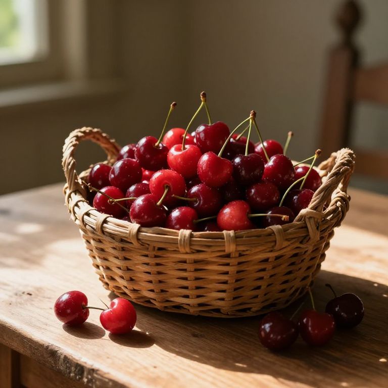 Photograph of a wicker basket filled with shiny, vibrant red cherries, placed on a sunlit wooden table. The basket has two curved handles and is brimming with cherries, with a few scattered on the table. Natural light streams in from a window on the left, casting soft shadows. The background is blurred, featuring neutral-colored walls and a wooden chair. The cherries' smooth, glossy skins reflect light, emphasizing their freshness and ripeness. The overall scene exudes a warm, rustic charm.