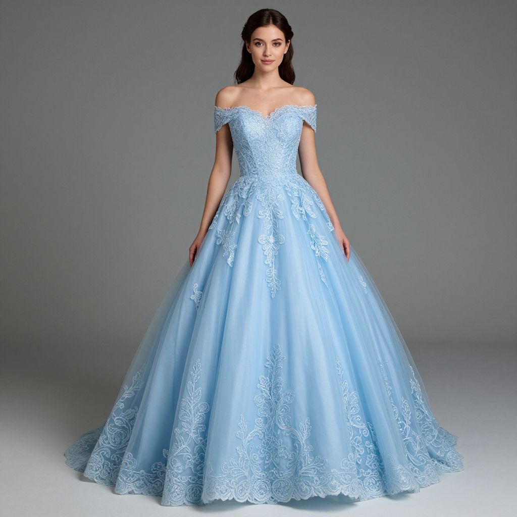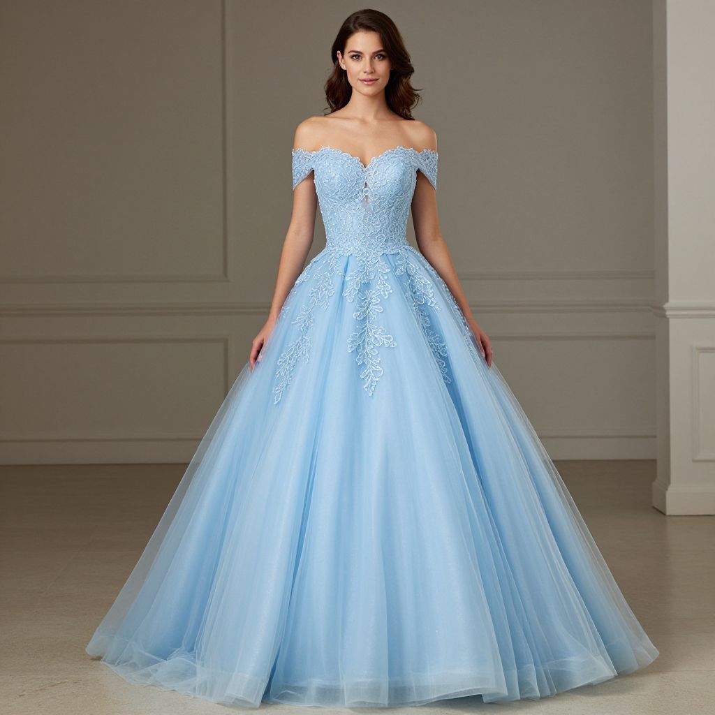 Elegant woman modeling a romantic, light-blue off-the-shoulder tulle lace appliqué ball gown by Marptom Grow, perfect for prom or formal events.