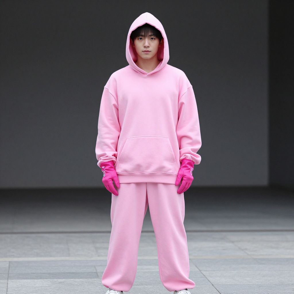 Photograph of an Asian male model standing centered on a gray, tiled floor against a dark gray, gradient background. He wears a light pink, oversized hoodie with a hood, matching light pink sweatpants, and bright pink gloves. His expression is neutral, with short, black hair partially visible under the hood. The model's skin tone is light, and the clothing's soft texture contrasts with the sleek, modern background. The overall style is minimalist and contemporary, emphasizing the pastel pink outfit against the dark backdrop.