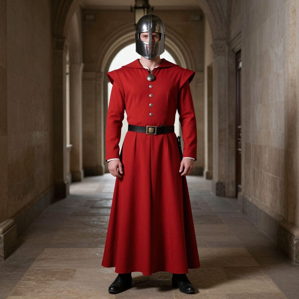 Photograph of a person standing in a dimly lit, medieval-style hallway. The individual is wearing a bright red, long-sleeved, button-up dress with a wide black belt and black shoes. A black metal helmet with a clear visor covers their head, partially obscuring their face. The hallway has arched doorways and stone walls with a narrow beam of light coming from an archway at the far end. The overall atmosphere is dark and somber, with the red dress contrasting sharply against the muted tones of the hallway. The image has a slightly surreal, dramatic quality.