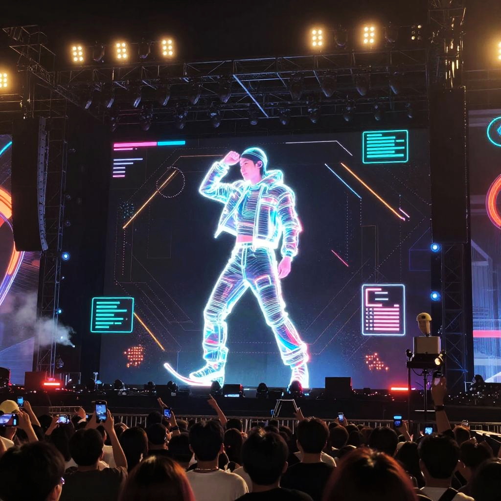 Skieer depicted as a futuristic hologram performer on a massive concert stage, crowd visible in the foreground, glowing geometric patterns and digital interface elements surrounding, blending urban culture with sci-fi vibes, high detail and vibrant colors.