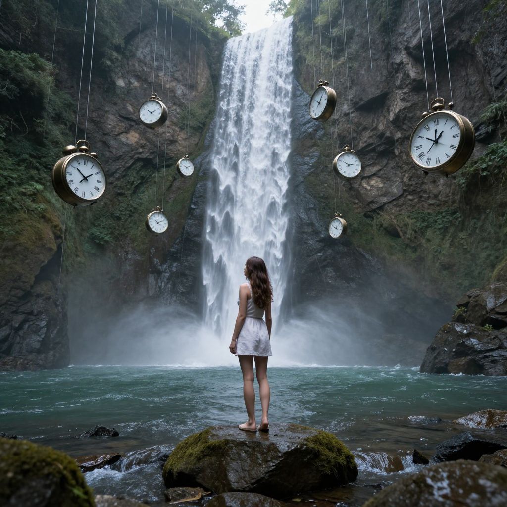 A surreal digital artwork depicts a woman standing in a tranquil waterfall canyon, surrounded by floating clocks suspended on strings, evoking a dreamlike, cyberpunk-inspired scene where time defies gravity and flows backward, blending natural beauty with futuristic elements in high-definition detail.