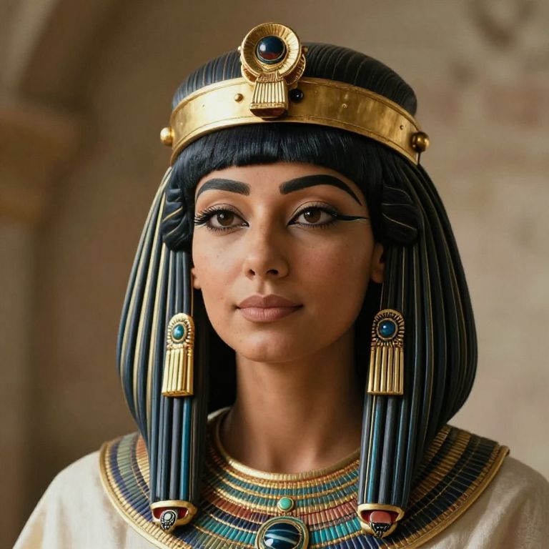 Digital artwork of an Egyptian queen with dark blue bob haircut, gold headpiece, and striped necklace, featuring turquoise and gold accents.