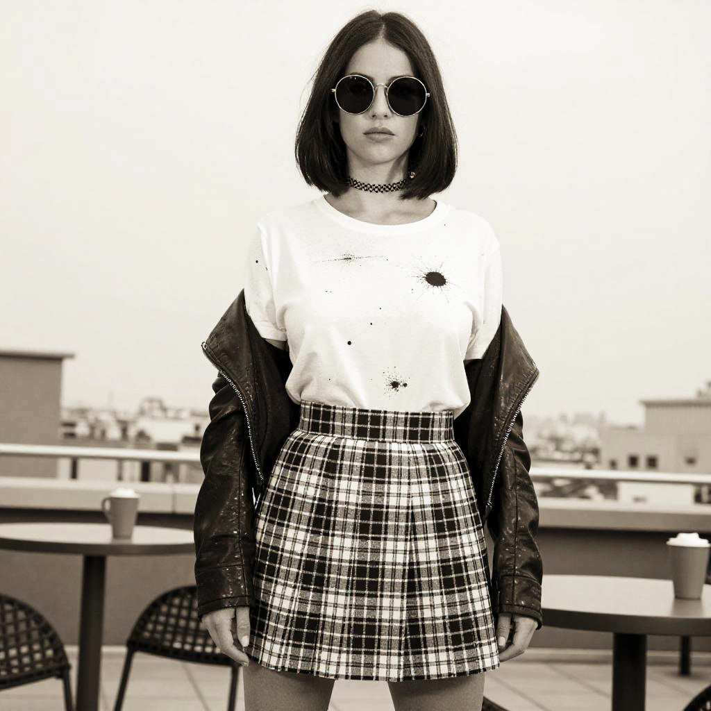 Photograph of a young woman with fair skin and straight, shoulder-length dark brown hair. She wears round sunglasses, a white t-shirt with a small black star design, and a black leather jacket draped over her shoulders. Her high-waisted, black-and-white plaid skirt is short and flared. She accessorizes with a black choker necklace. The background is a blurred rooftop with tables and chairs, suggesting an urban setting. The image has a monochrome, high-contrast filter, emphasizing the black and white elements. The woman stands centered, facing the camera with a neutral expression.