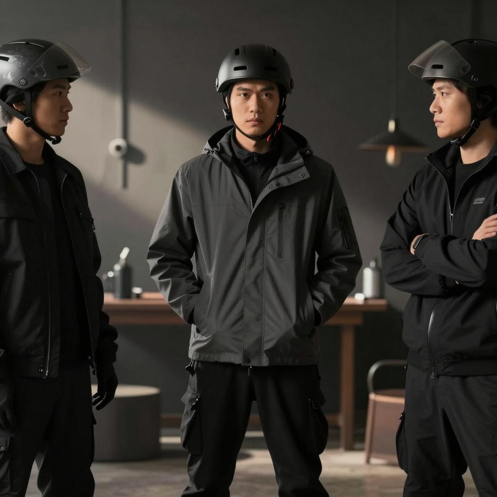 Three people in dark clothing and helmets stand in a dimly lit room. Center person wears a gray jacket and pants, hands in pockets. Left person partially visible, right person arms crossed. Background has shadowed objects and a light source.