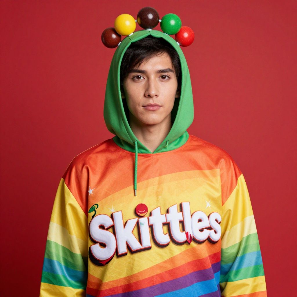 Editorial waist-up portrait of a person wearing a vibrant Skittles-themed costume with a green hood and colorful rainbow stripes. The costume features the Skittles logo in bold letters and a headpiece decorated with large Skittles candies. Set against a solid red background.