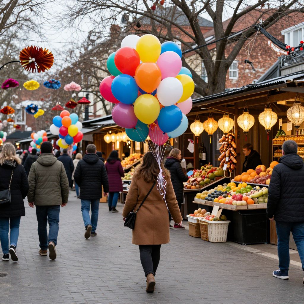 Vibrant balloons float above a bustling market square, where a woman in a brown coat carries a cluster of colorful balloons while strolling past fruit stalls and lantern-lit shops, creating a lively atmosphere filled with people and festive decorations.