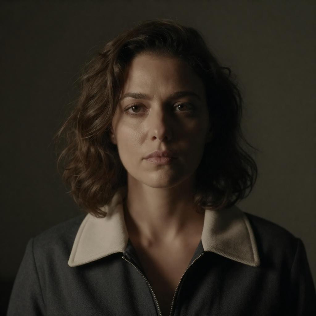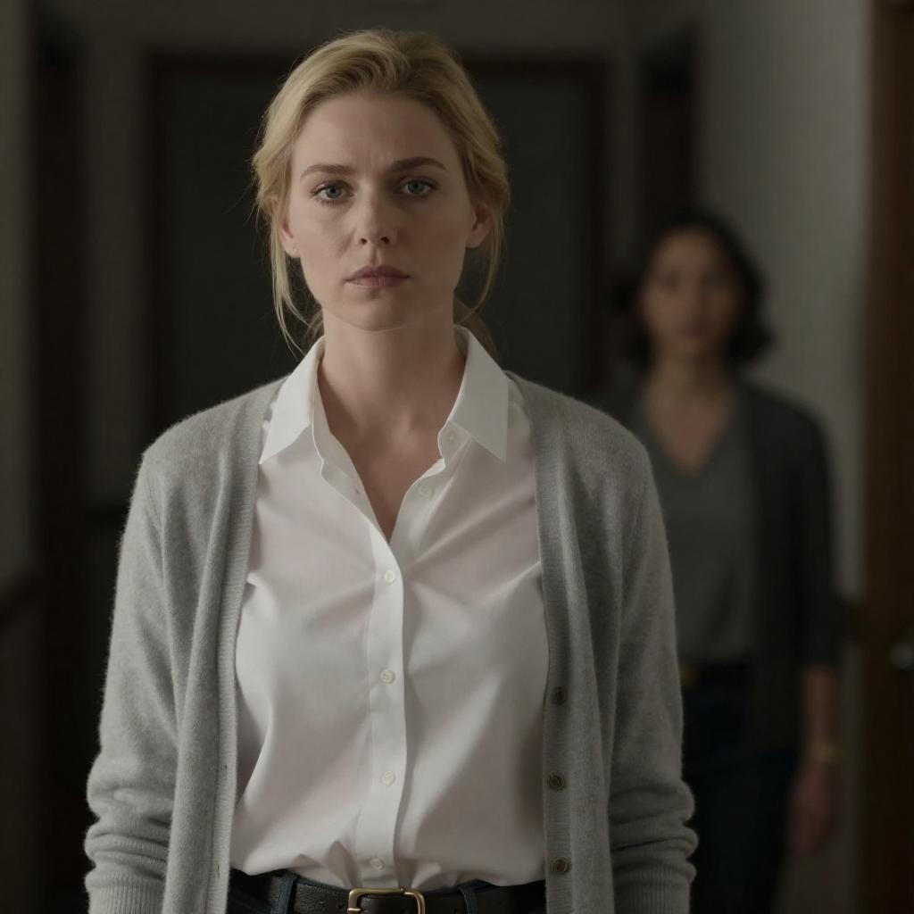 Photograph of a woman in a red dress, restrained on a chair with metal cuffs on her wrists and ankles. She has short brown hair and a neutral expression. Background includes a dimly lit, beige-walled room with a metal apparatus behind her. She is the central figure, seated, with her arms resting on the chair's armrests.
