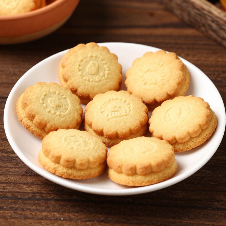 Six golden Claridge's Shortbread Biscuits neatly arranged on a white plate, showcasing their crisp edges and subtle embossing, rest atop a dark wooden surface with a terracotta bowl visible in the background.
