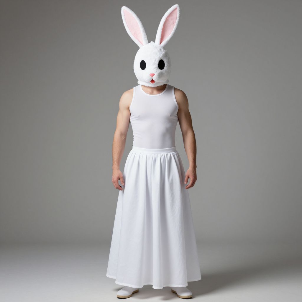 Easter Drama Costume, man in a costume with a rabbit head and a long skirt