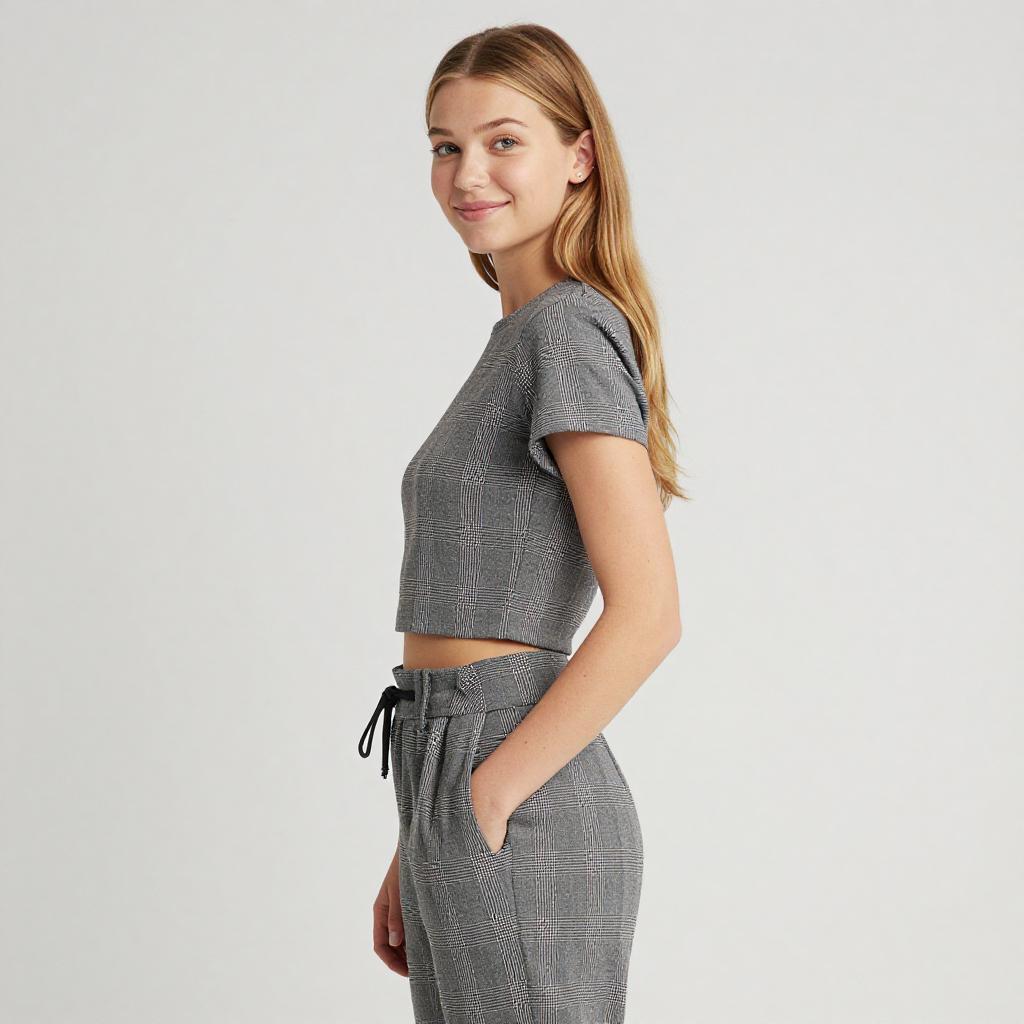 Photograph of a young woman with long blonde hair, light skin, and a slim build. She wears a gray plaid crop top and matching high-waisted pants, standing in profile with a slight smile. Her right hand rests on her hip. The background is plain white.