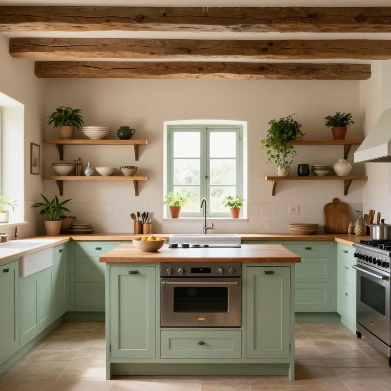 Cozy Provence kitchen featuring light green cabinetry, a central island with a wooden countertop, and a large stainless steel range oven flanked by open shelving displaying pottery and plants, all under a rustic wooden beam ceiling and illuminated by natural light streaming through a multi-paned window.