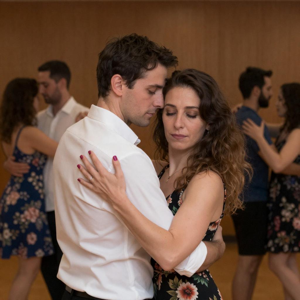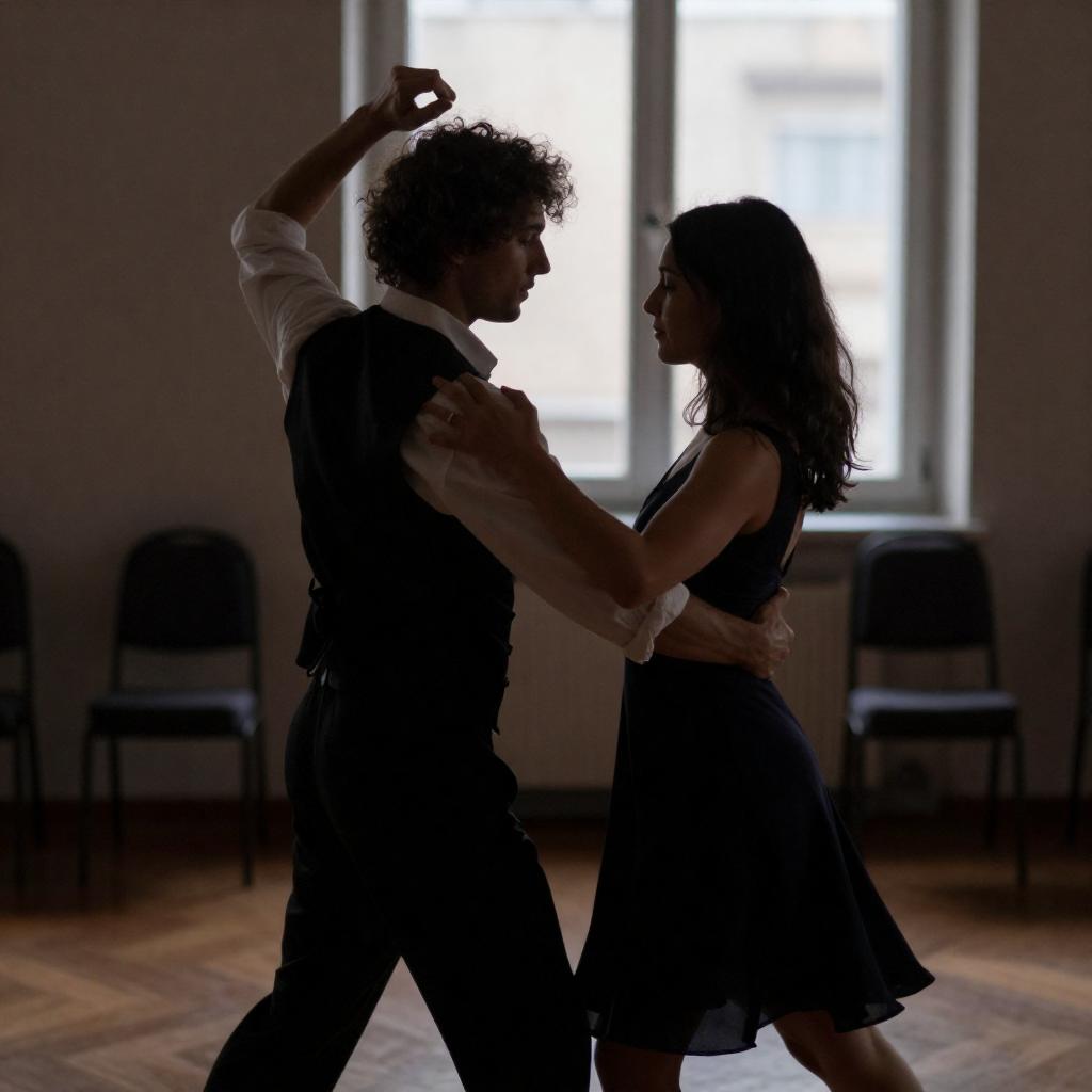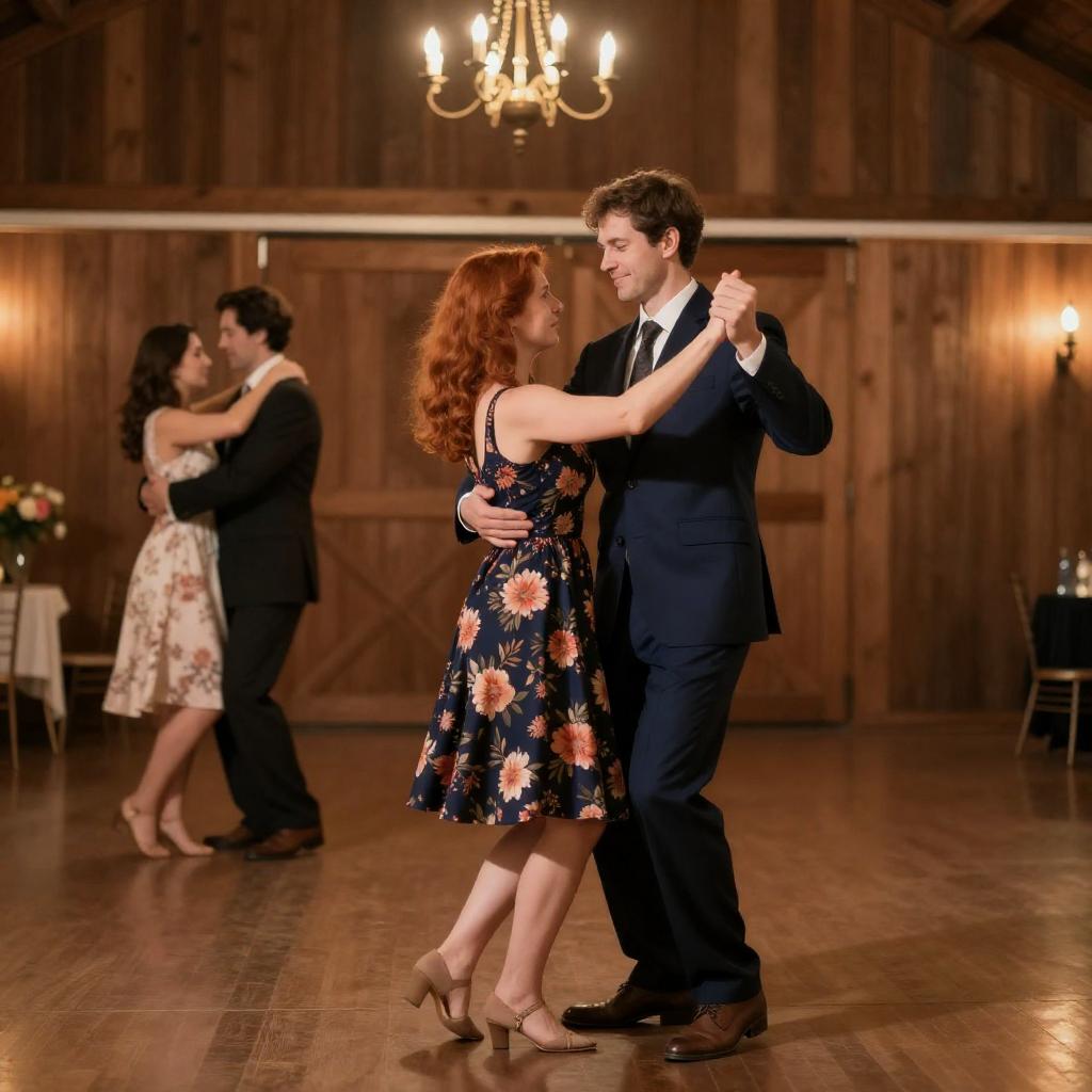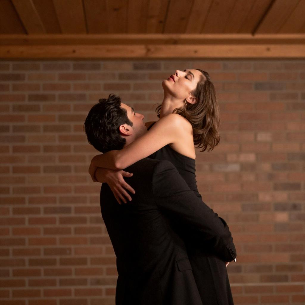 Photograph of a man in a black suit holding a woman with brown hair, who is leaning back with her head tilted up. Brick wall and wooden ceiling in the background. Warm lighting. Man's face not visible, woman's face intense.