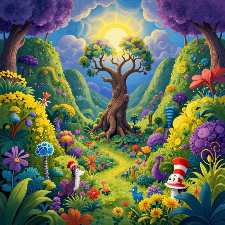 Envision an enchanting garden landscape inspired by Dr. Seuss's whimsical imagination, teeming with fantastical plants and creatures. The scene is captured from a bird's-eye view, revealing the intricate foliage cascading down steep mountain slopes. At its core lies a wise old tree, its twisted branches reaching upward like welcoming arms to grasp for a glowing sun hidden behind swirling clouds. The garden's flora boasts a vivid color palette that transitions from lively greens and yellows at ground level to deeper purples and blues in the upper canopy, evoking a sense of enchantment and mystery as one delves into this delightful wonderland.
