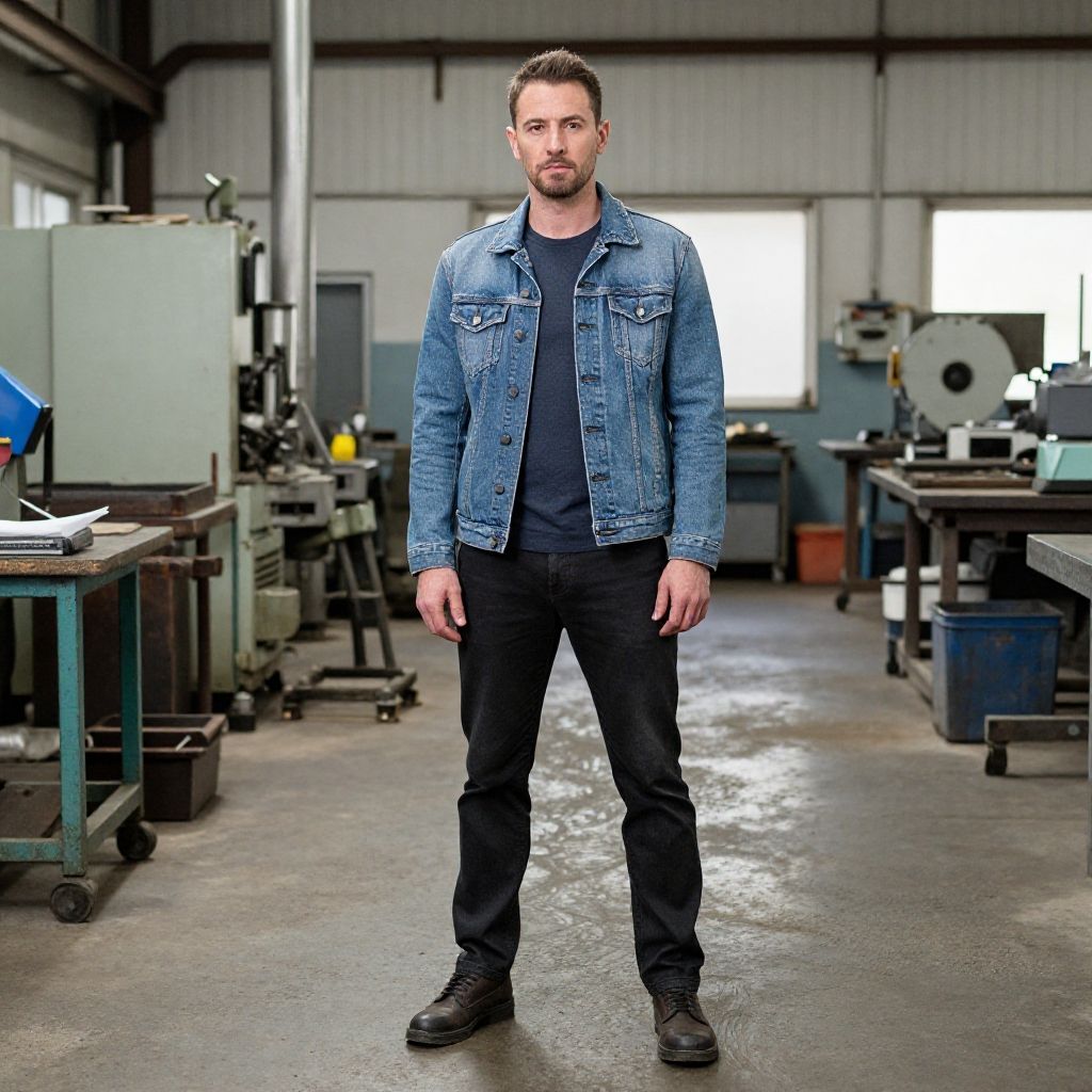 A man in a denim jacket stands confidently in an industrial workshop setting, with machinery and workbenches in the background.