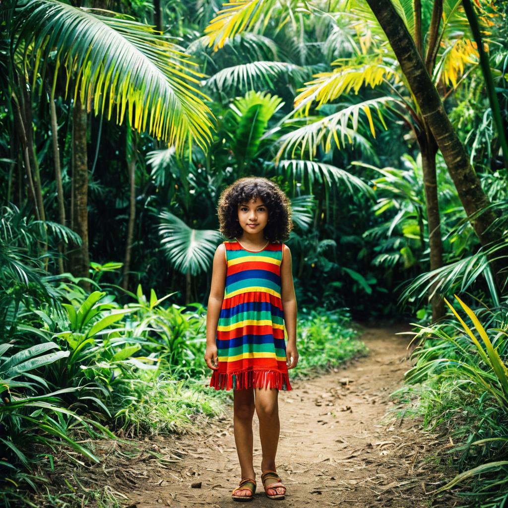 Photograph of a young blonde girl with small hair buns wearing a sleeveless camouflage dress and brown sandals. She stands on a forest path surrounded by trees, dry leaves, and grass. The image features soft natural light with a slight background blur, portraying a candid and serious expression in a summer forest setting.