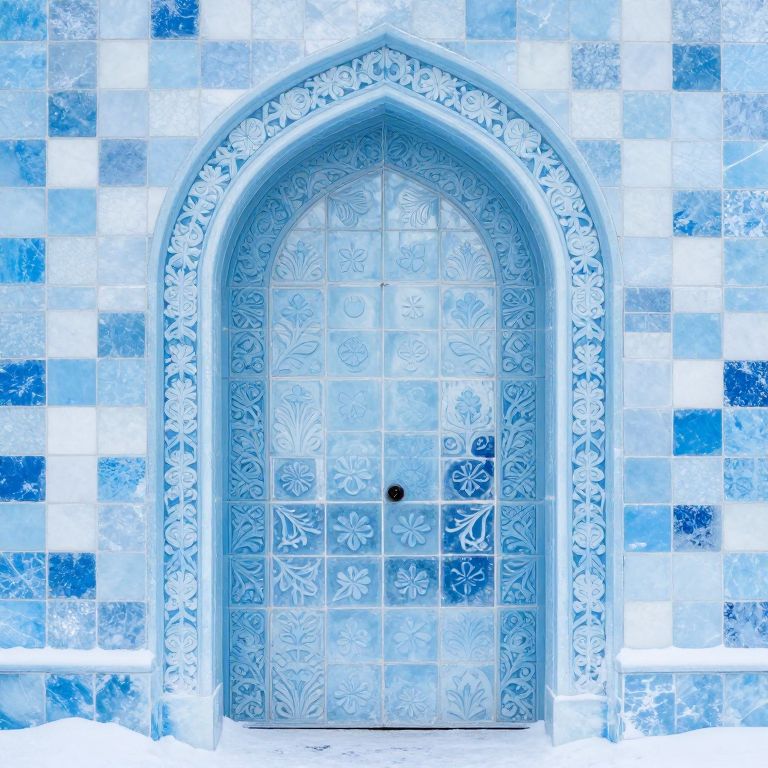 A beautifully detailed arched doorway covered with icy blue and white floral patterned tiles. The door is set within a mosaic wall of blue and white blocks, evoking a winter and frozen aesthetic with intricate designs and a serene, cold ambiance.