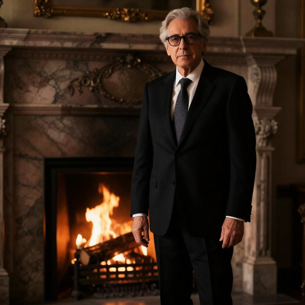 Middle-aged man with gray hair and glasses, wearing a black suit and tie, stands in front of a lit fireplace. His right hand rests on the fireplace's mantel, holding a burning log. Ornate fireplace with dark marble frame. Warm, dim lighting. His expression is neutral. Firelight illuminates his face. Classic, elegant setting.