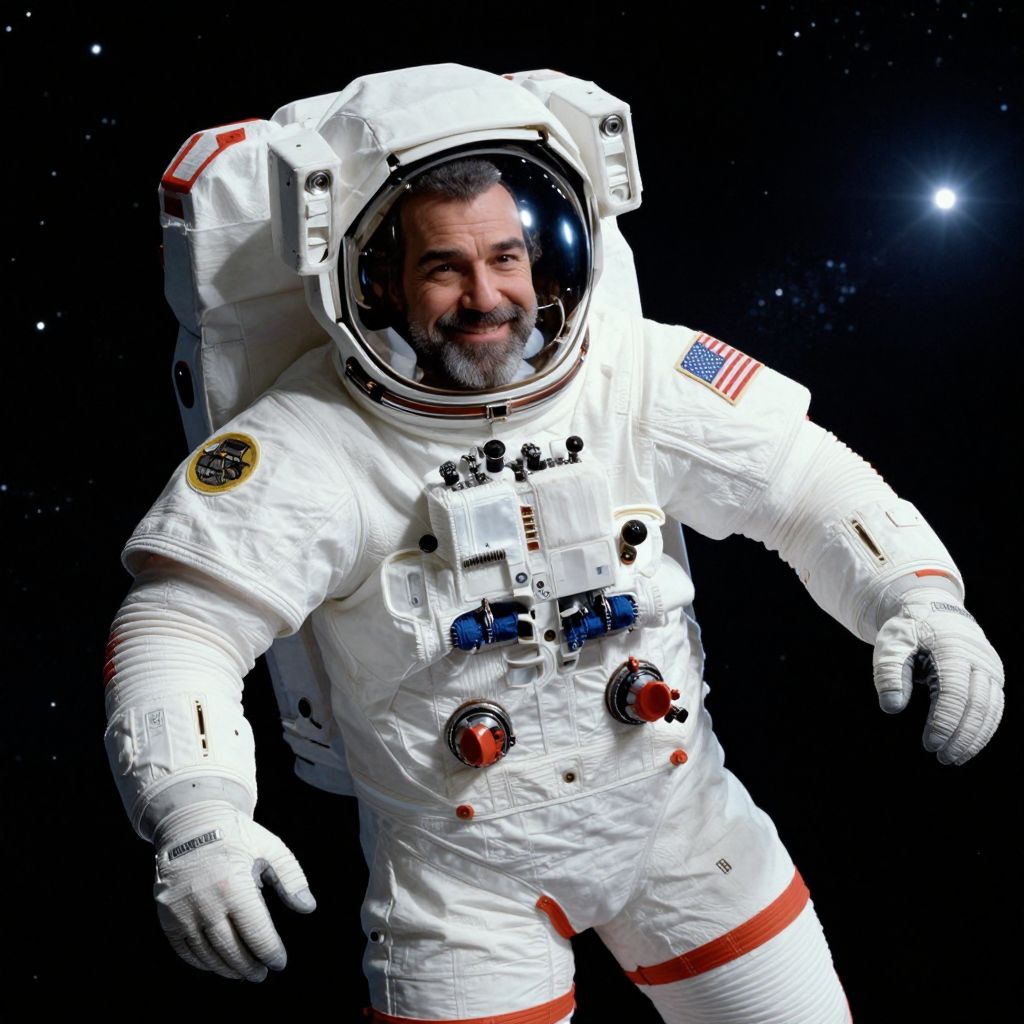 Photograph of a middle-aged man with a beard and slightly graying hair, smiling while floating in space. He's wearing a bulky white astronaut suit with a reflective helmet, American flag patch, and various control buttons. The background is a dark, starry space with a bright star on the right. His suit looks detailed and realistic, with visible fabric textures and padding.