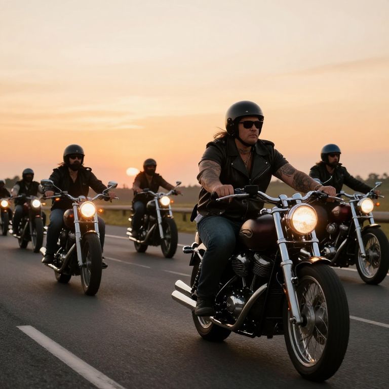 Hevy biker festival on an open highway, group of motorcyclists riding vintage bikes, sunset background with warm hues, leather jackets, tattoos, and strong camaraderie vibe, detailed motorcycles and adventurous spirit.